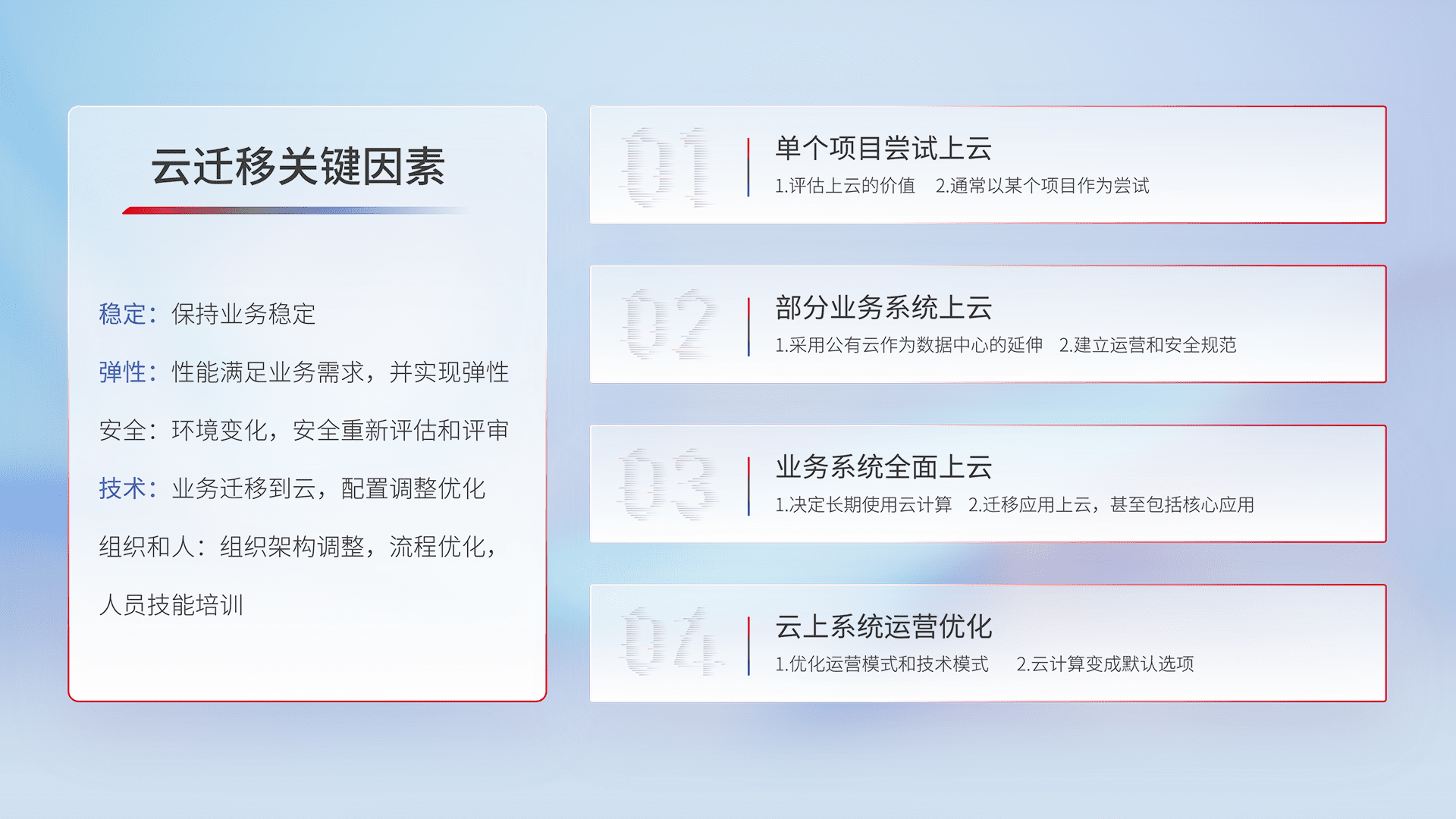 结合实际业务,,,从规划设计、、云平台选型、、、、云原生改造、、、、数据迁移、、、、集成交付,,,,迁移全过程为客户识别最佳上云路径,,做好风险识别管理,,,设计网络架构、、身份权限、、安全审计合规、、、操作审计、、日志审计、、监控告警策略、、、、多站点容灾设计等,,,对云上基础设施进行整体规划,,提升IT治理水平,,以满足弹性、、高可用、、、、高性能的需求。。