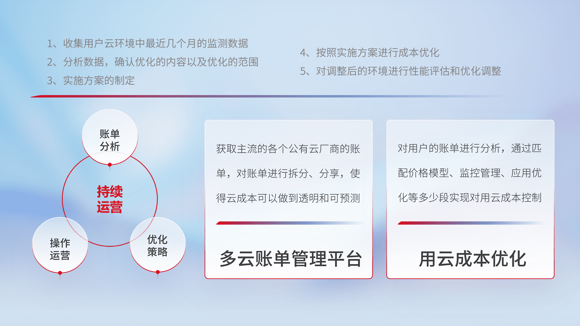 通过多云纳管,,以统一的资源数据模型把客户的云资源进行抽象和封装,,进而实现对多云资源的统一操作,,,,保障云资源管理的可靠性、、稳定性与可用性。。。。量身定制化运维内容,,,配置、、、开发运维、、、补丁管理、、、备份、、监控、、、、认证和访问管理、、、审计和日常巡检等,,保障在用云过程中的可靠度,,,稳定度以及高可用率。。