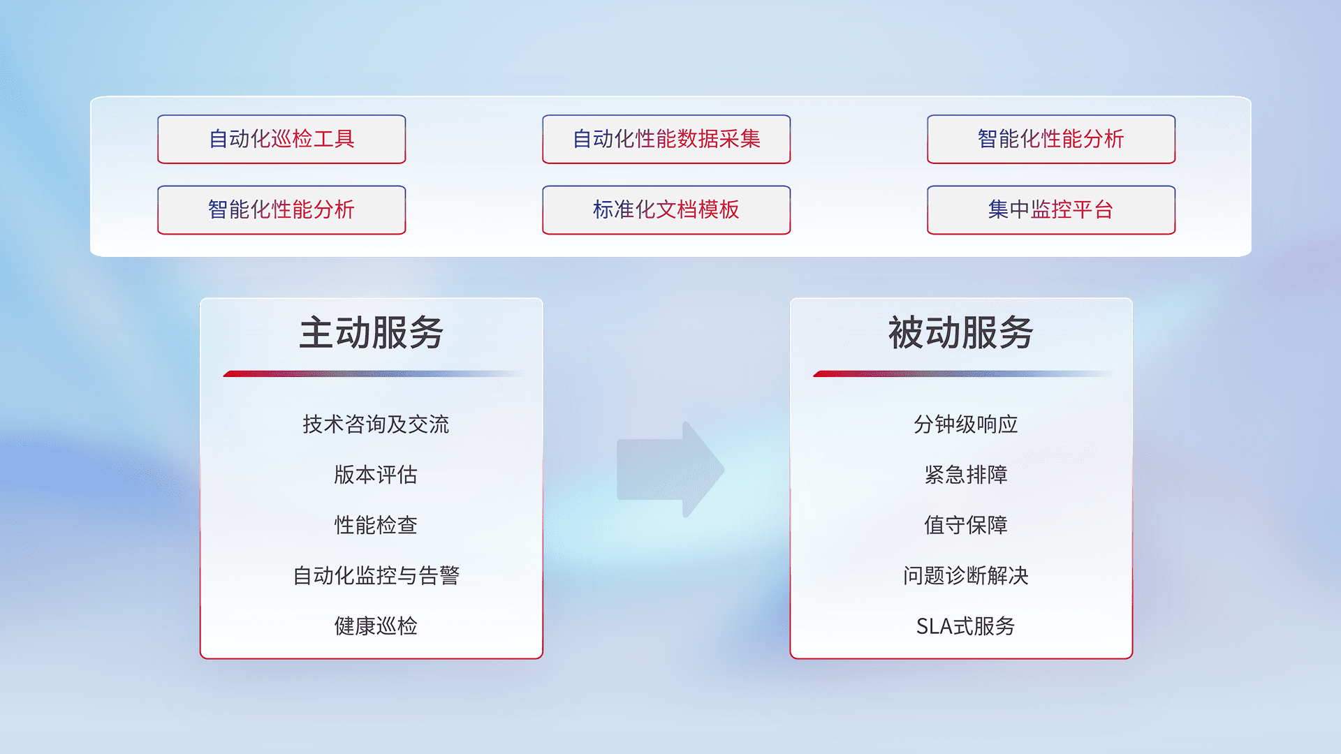 智能化工具和标准化文档,,,,保障服务质量,,,提供主动服务(包含技术咨询、、、版本评估、、、性能检查、、、自动化监控与告警、、健康巡检)和被动服务包含(分钟级响应、、、紧急排障、、、、值守保障、、、、问题诊断解决、、、、SLA服务)。。。。