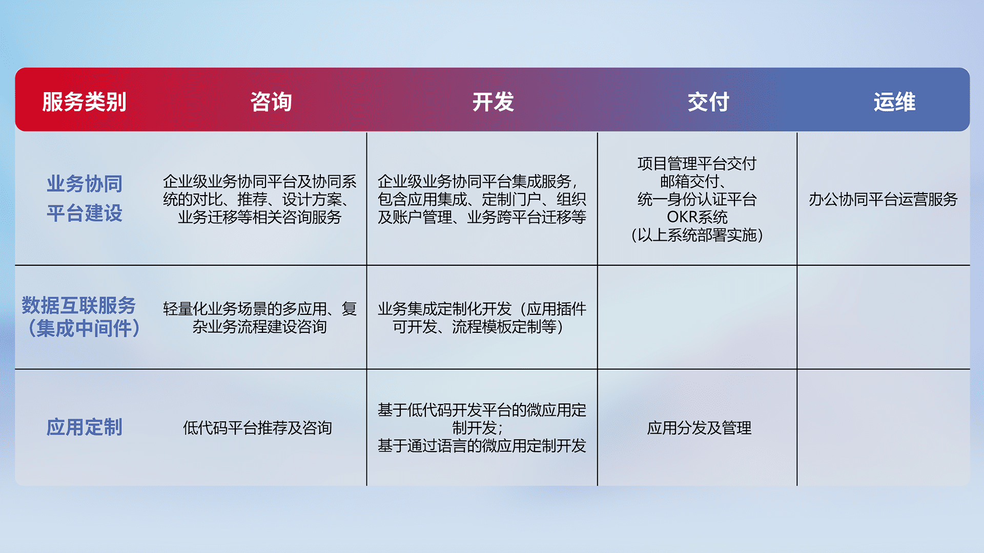 针对钉钉、、企微、、、IDaas等平台级产品提供产品的规划、、、、方案、、、、交付、、、、定制化开发等服务,,,,实现如统一协同办公、、、智能客户服务、、、、混合会议管理、、智能数据查询、、等业务场景,,,,实现数字化转型。。。。